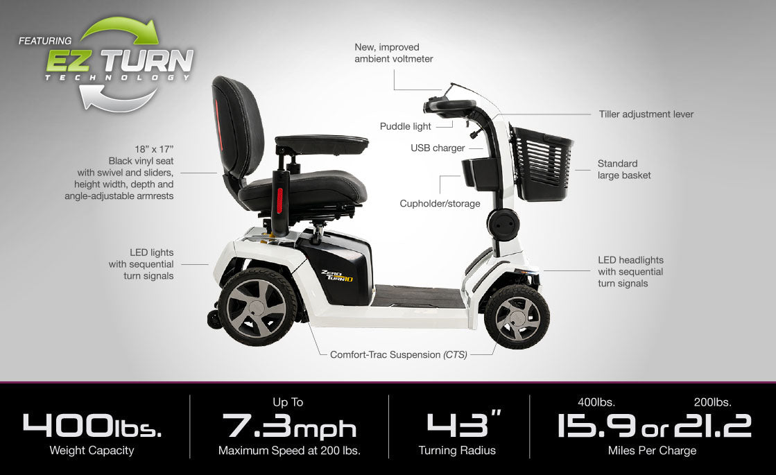 The Zero Turn 10 mobility scooter gives you all-day reliability with the battery capacity to cover up to 21.2 miles on a single charge. That’s almost a marathon. With top speeds up to 7.7 mph, and a 400-pound weight capacity, we give you the tools for a future more fulfilled.