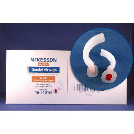 The McKesson Guedel Oropharyngeal Airway for adults is a triple-purpose airway device designed to maintain a clear airway in anesthetized or unconscious patients. It serves as a bite block, tongue depressor, and airway for tube insertion. Made of smooth HDPE with an anatomically contoured design, it allows gentle insertion while minimizing tissue trauma. Each airway features a rigid bite block to prevent airway collapse and is color-coded for easy size identification. Non-sterile and individually wrapped, these airways are intended for single-patient use and are latex-free.